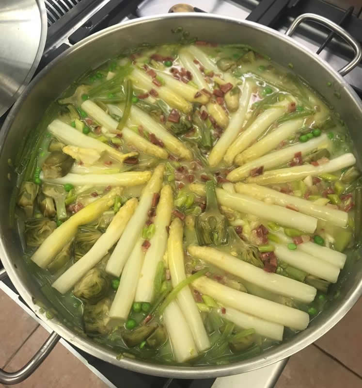 Los espárragos se pueden poner desde agua fría y los podemos cocer enteros o partidos por la mitad, en este caso daremos cinco minutos más de margen a las traseras que a las yemas, podemos añadir un poco de azúcar para quitar el ligero amargor del espárrago, escurrimos, guardamos un poco del agua de cocción y a la cazuela con el resto de verduras. Si la verdura es muy fresca con 15 minutos para alcachofas y espárragos es suficiente, estos últimos los suelo dejar un rato en el agua de cocción fuera del fuego.