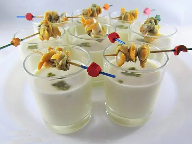 Presentamos en vasitos con un poco de cebollino o albahaca y los berberechos trinchados en un palillo, y un poco de aceite de oliva.