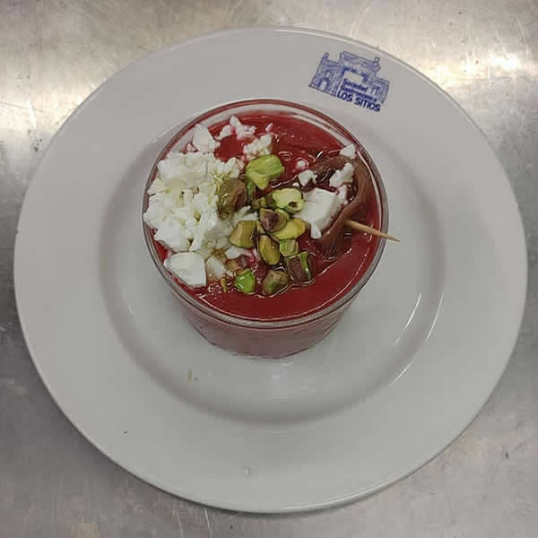 Se deshuesan las cerezas y se pican groseramente el resto de ingredientes, se añade sal, aceite y el vinagre al gusto, se tritura todo en un baso americano y se cuela por un colador fino. Se deja enfrira y ya está.