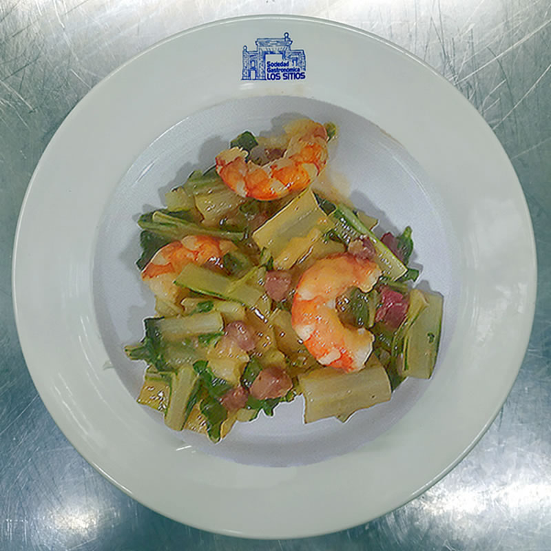Agrega la harina, rehógala durante un par de minutos. Incorpora las acelgas y 300 ml del caldo cocción y cocina la mezcla durante 3 minutos.