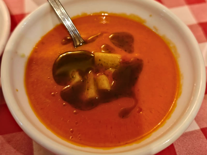 Se pelan los melocotones (reservamos 2 para la guarnición) y se pican groseramente con el resto de ingredientes en una olla alta mediana, se añade sal, aceite y un poco de vinagre de manzana poco a poco al gusto, se tritura todo con el brazo grande y se cuela por un colador fino, si es necesario rectificar de sal, aceite y vinagre Se deja enfriar y ya está.