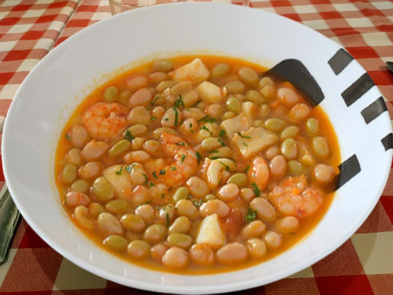 Añade las pochas y deja hervir 5 minutos a fuego suave o hasta que estén tiernas, da punto de sal. Fuera del fuego añade las gambas. Decora con perejil picado