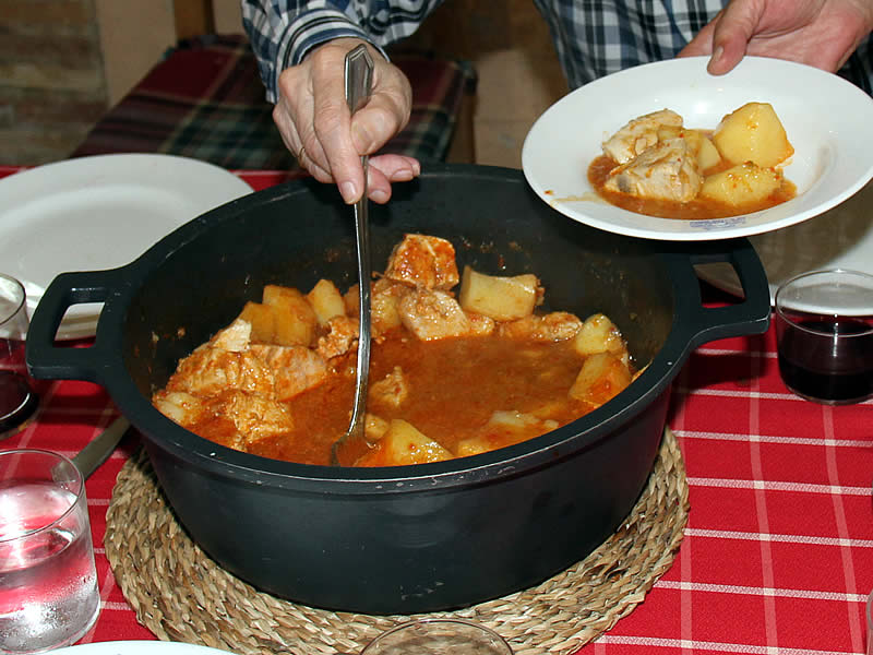 Picamos la verdura del sofrito (cebollas, ajo, el blanco del puerro y pimiento verde) y dejamos pochar como una hora, iremos removiendo y añadiendo chorritos de caldo para que no se nos quemen las verduras, cuando ya estén caramelizadas las cebollas aromatizamos con un poco de whisky, pasamos el sofrito por el pasapurés y lo devolvemos a la perola, añadimos dos cucharadas de carne de pimiento choricero y una cucharadita de tomate concentrado, añadimos las patatas chascadas que rehogaremos un par de minutos, añadimos una cucharada de pimentón y caldo hasta cubrir las patatas, un par de hojas de laurel, y ahora es el momento de dar punto de sal (recordar que salaremos el bonito).