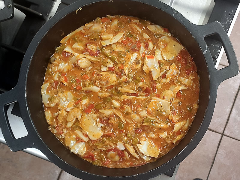 3.- Preparar el sofrito: Pochar las cebollas y los pimientos verdes a fuego suave sin que cojan color con el aceite que hemos retirado del bacalao unos 20 minutos, añadimos unos 200 g de carne de pimiento choricero, los piquillos a tiras, el tomate frito y el pil-pil, probamos y damos punto de sal. Al final añadimos el bacalao, le damos unas vueltas y plato acabado. En Pamplona se suele añadir “nobleza” a este plato añadiendo un poco de bogavante, gamba roja, langostinos o simplemente unos huevos escalfados.