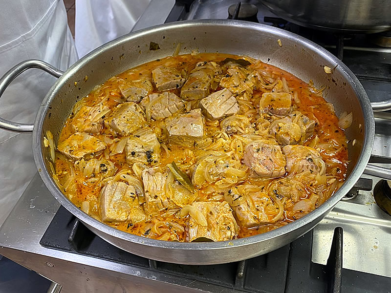 El atún de almadraba encebollado es una receta típica de Cádiz y seguramente la receta que tiene más predicamento es la del restaurante “El Campero” en Barbate, eligen el “mormo” del atún para realizar este plato, pero sirven otras piezas del ronqueo como el contramormo ó parpatana muy ricas en grasa infiltarda, nosotros lo hacemos con lomo con menos contenido en grasa pero más fácil de conseguir, lo cocinamos menos tiempo para que nos quede muy jugoso.