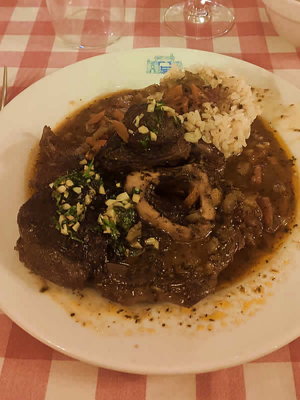 Calentar el aceite de oliva en la sartén. Freír en ella por ambas partes los trozos de pata de ternera. Sacar la carne y rallar en el interior la zanahoria y el apio. Añadir el tomate cortado en trozos y un diente de ajo prensado. Rehogar las verduras a fuego fuerte durante un corto tiempo. Poner el puré de tomate, la sal, la pimienta las hierbas y regarlo con el vino tinto y añadir la carne. Cocerlo durante 20 minutos en una olla a presión ó 1,5 h en olla abierta hasta que la carne esta tierna. Entretanto, se machaca el perejil muy fino y se mezcla con el segundo diente de ajo prensado. Finalizada la cocción se enfría se coloca la carne en una fuente precalentada, la salsa se deja espesar algo más a fuego alto y se derrama sobre la carne. El perejil, el ajo, la mantequilla se calientan en una sartén pequeña y se distribuye sobre la carne.