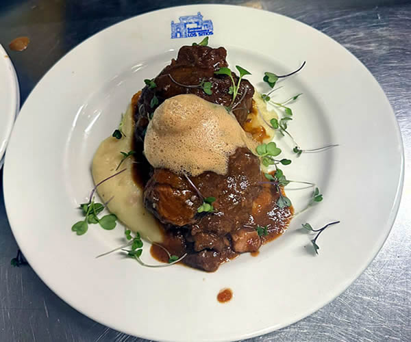 Presentamos con un poco de Parmentier en el centro del plato, encima las carrilleras, salseamos y después una cucharada de espuma de PX, decoramos con unos brotes.