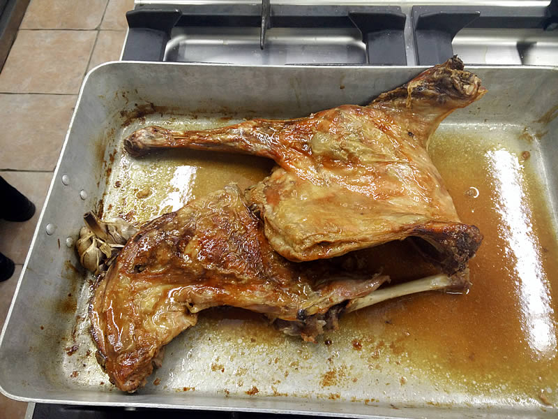 Lo introducimos con la piel para abajo en el horno precalentado a 160º durante una hora, (el tiempo en el horno es siempre difícil de calcular, si asamos piezas iguales como paletillas, piernas o incluso solo costillas, el asado es más homogéneo que por lechales en  mitades o enteros,el tiempo variará en función del grosor de las piezas), dando vueltas cada 15 minutos y mojando con el líquido del fondo, lo normal es que en ese tiempo ya tenga un bonito color tostado, damos la vuelta y dejamos 15 minutos más la misma temperatura. Pasados esos 15 minutos subimos el horno hasta 180-200º para rustir la piel y quede crujiente. Nunca debe de faltar líquido en el fondo de la bandeja, poner unas ramas de romero en los últimos 5 minutos.