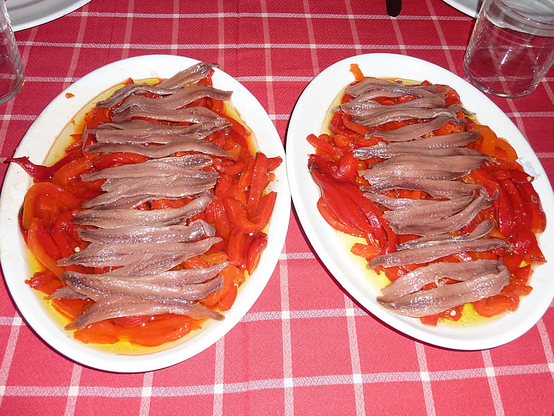 Escurrimos el jugo que han soltado los pimientos, colocamos en una fuente con un chorretón de aceite y sal en escamas (cuidado que las anchoas llevan sal) y las anchoas encima. Unas rebanadas de pan tostado con un poco de ajo es un buen complemento.