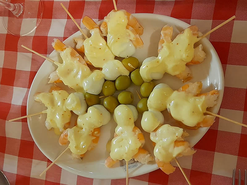 Nostros empleamos huevos de codorniz en lugar de medio huevo duro, insertamos en un palillo dos langosgtinos el huevo duro y un par de aceitunas rellenas, napamos con mahonesa y opcional rallamos en cima un poco de huevo cocido.