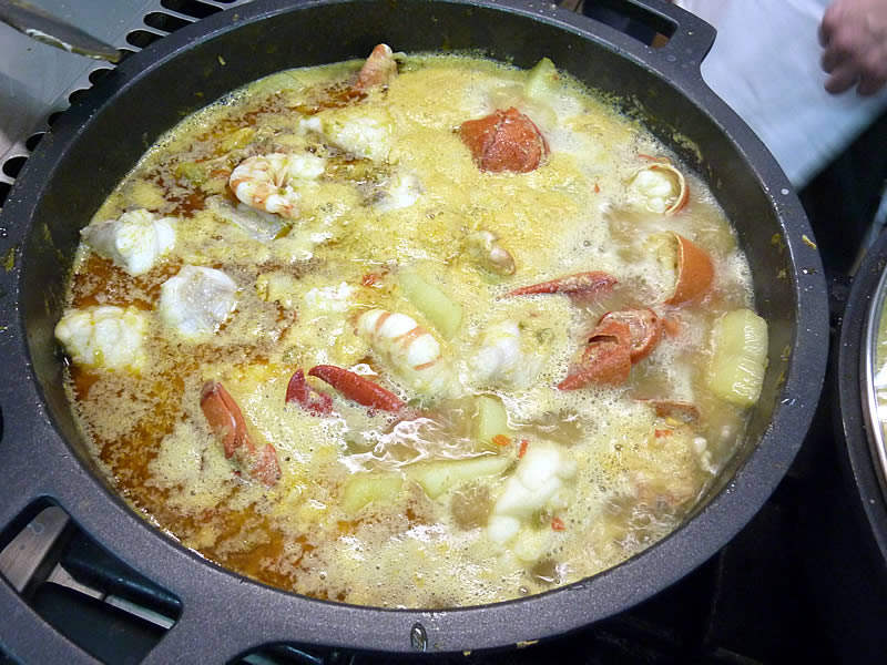 Cortamos el rape en trozos medianos, de los bogavantes separamos las cabezas (las cortamos por la mitad y cada media en dos trozos) y muelas (las golpeamos para abrirlas), las colas en cuatro trozos cada una y las patas pequeñas y restos para el fumet, limpiamos las colas de los langostinos.