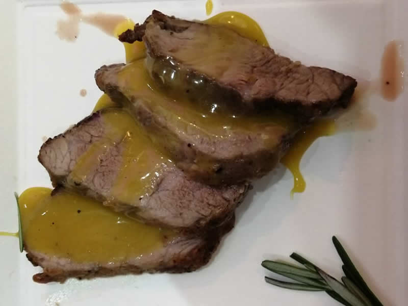 Después de sacar las presas las dejamos reposar unos minutos, (deben de quedar rosaditas al centro), cortamos filetes no muy gruesos, napamos con la salsa de miel y ponemos una quenelle de puré.