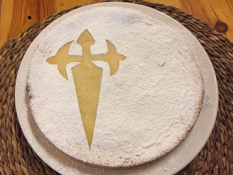 Desmoldear una vez fría, colocar sobre la tarta la forma de la cruz de Santiago y espolvorear ázucar glass.